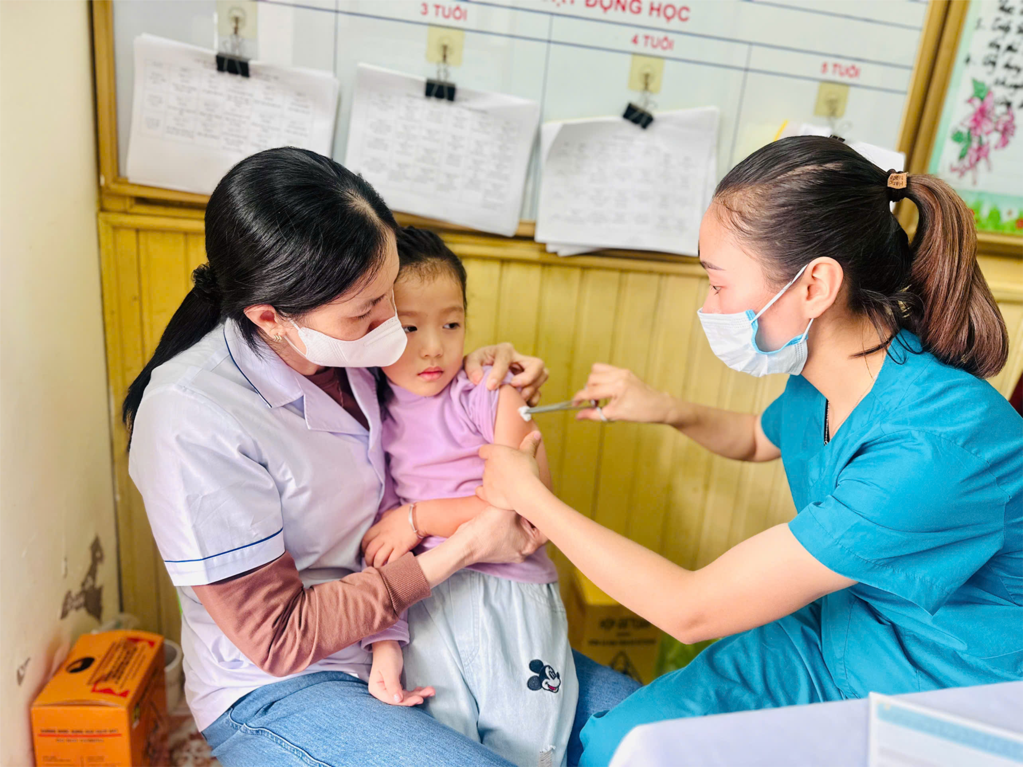 Chính vì những biến chứng nguy hiểm do cúm mùa gây ra, chiều ngày 06 tháng 11 năm 2024, Trường Mầm non Quận phối hợp với Trung tâm y tế phường Hải Sơn tiến hành tiêm vắc xin phòng cúm cho trẻ. Được sự quan tâm và hỗ trợ của cha mẹ trẻ trong công tác tiêm chủng, nhà trường thuận lợi trong việc rà soát, lấy ý kiến phụ huynh đồng ý tiêm cho trẻ chưa tiêm đủ mũi vắc xin cũng như trẻ chưa được tiêm.