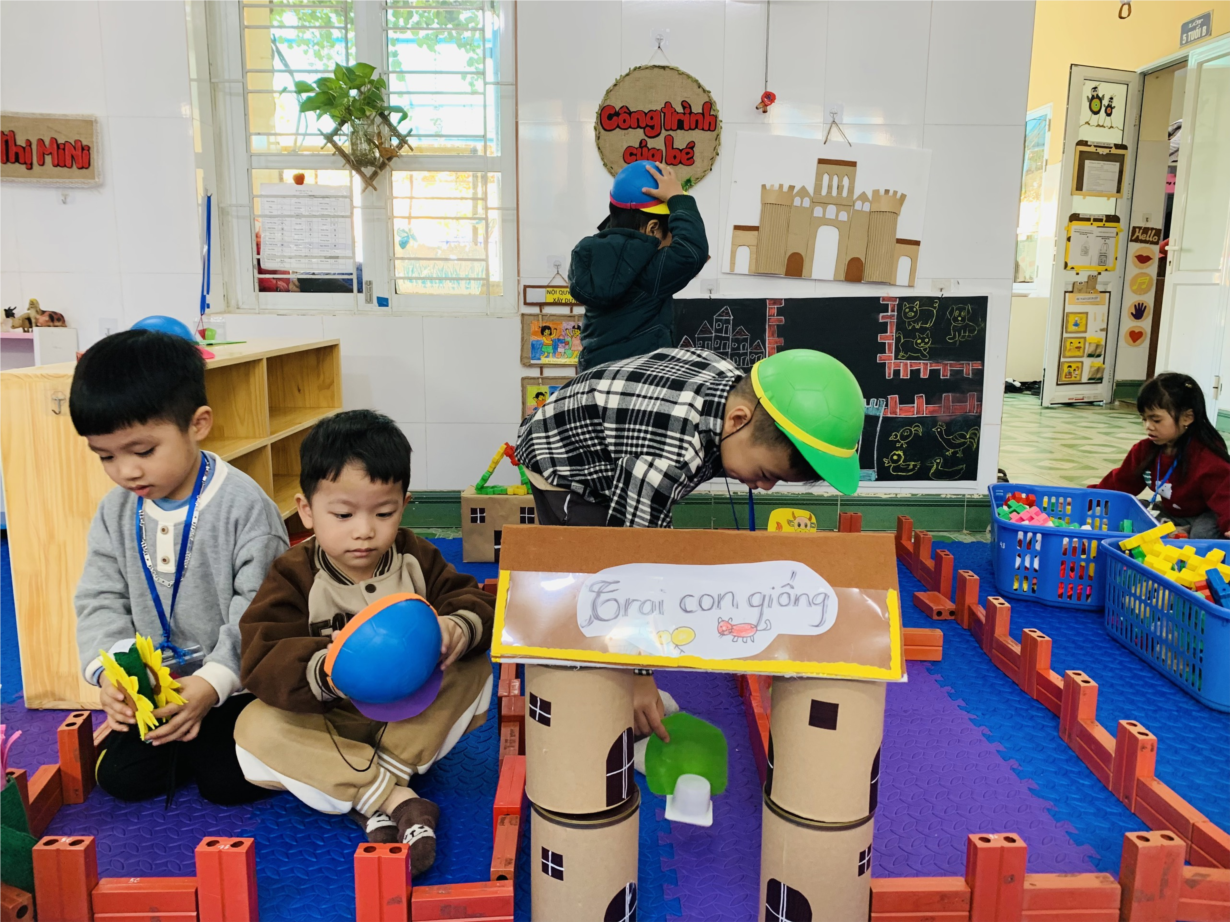 Để chuẩn bị cho buổi chơi hoạt động góc của trẻ, ngay từ ngày hôm trước giáo viên và trẻ đã sử dụng nhiều nguyên vật liệu tự nhiên, đồ vật thật thiết kế môi trường mở để trẻ được thỏa sức sáng tạo, phát triển trí tưởng tượng. Cũng từ đó trẻ được trải nghiệm bằng chính những sản phẩm do tự tay trẻ tạo ra. Qua các góc chơi như góc xây dựng, góc phân vai, góc học tập, góc nghệ thuật,…trẻ được đóng vai là những cô giáo, bác sỹ, chú công nhân, cô bán hàng, bác đầu bếp,… được thực hiện những công việc hàng ngày của người lớn như nấu ăn, khám bệnh, làm bánh, nhặt rau,…với những đồ vật thật, gần gũi, gắn liền với cuộc sống hàng ngày của trẻ. Từ đó tái tạo lại cuộc sống của người lớn một cách tổng quát trong cảnh tưởng tượng, được tham gia vào xã hội người lớn theo cách riêng của mình.