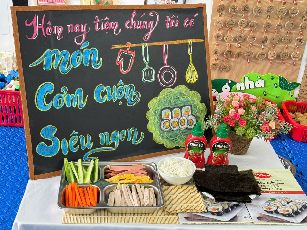 Với phương châm cung cấp cho trẻ những kiến thức, kỹ năng sống đơn giản và các kĩ năng tự phục vụ vừa sức của mình. Hôm nay, các cô và các bé lớp 5 tuổi A đã cùng nhau tham gia hoạt động bé khám phá quy trình làm cơm cuộn. Qua hoạt động các bé biết được quy trình các bước làm cơm cuộn rong biển: