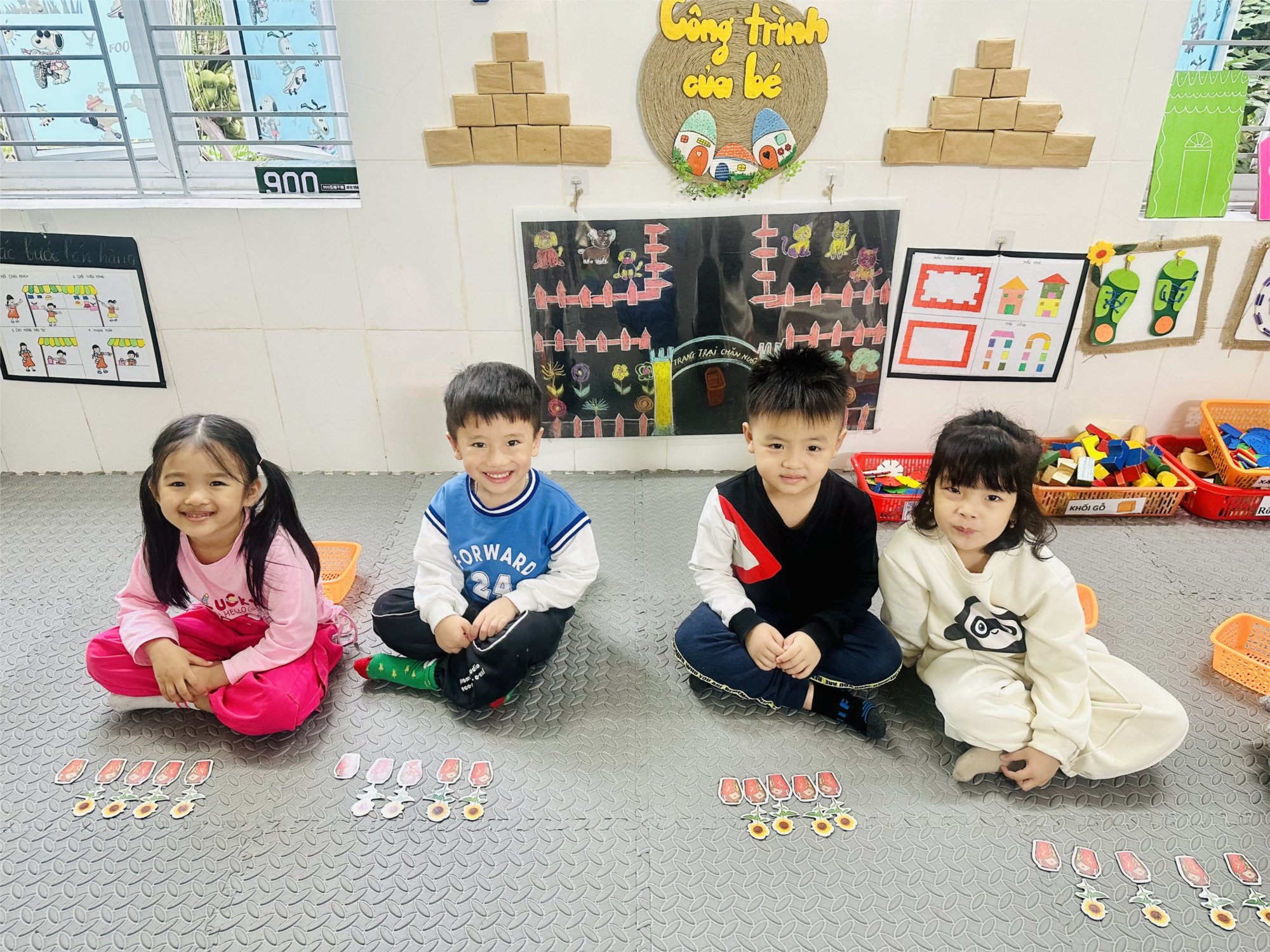 Trong các giờ hoạt động làm quen với toán, giáo viên giúp trẻ thực hiện một số thao tác, kỹ năng như xếp tương ứng 1-1, sắp xếp theo quy tắc, đếm, thêm bớt, định hướng trong không gian...ngoài ra giáo viên còn tổ chức cho trẻ trải nghiệm với các đồ dùng đồ chơi tự tạo để trẻ phát triển tư duy và trí tuệ... với nhiều hình thức đổi mới, hiện đại, phong phú đa dạng. Trẻ được lĩnh hội kiến thức một cách thoải mái “Chơi mà học, học mà chơi”.
