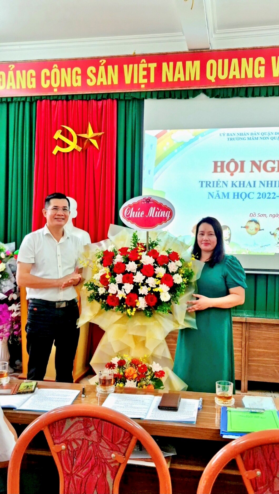 Ông Lương Trác Quyền - Trưởng Ban tuyên giáo Quận ủy tặng hoa chúc mừng nhà trường
