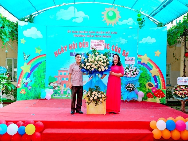 Rất vinh dự cho cô và trò nhà trường được đón tiếp Bác Vũ Đình Quang - Trưởng phòng Tư pháp quận - Đại diện lãnh đạo Uỷ Ban nhân dân quận Đồ Sơn, cùng các cô bác chuyên viên Phòng Giáo dục, Ban đại diện Cha mẹ học sinh các lớp về dự và tặng hoa chúc mừng.