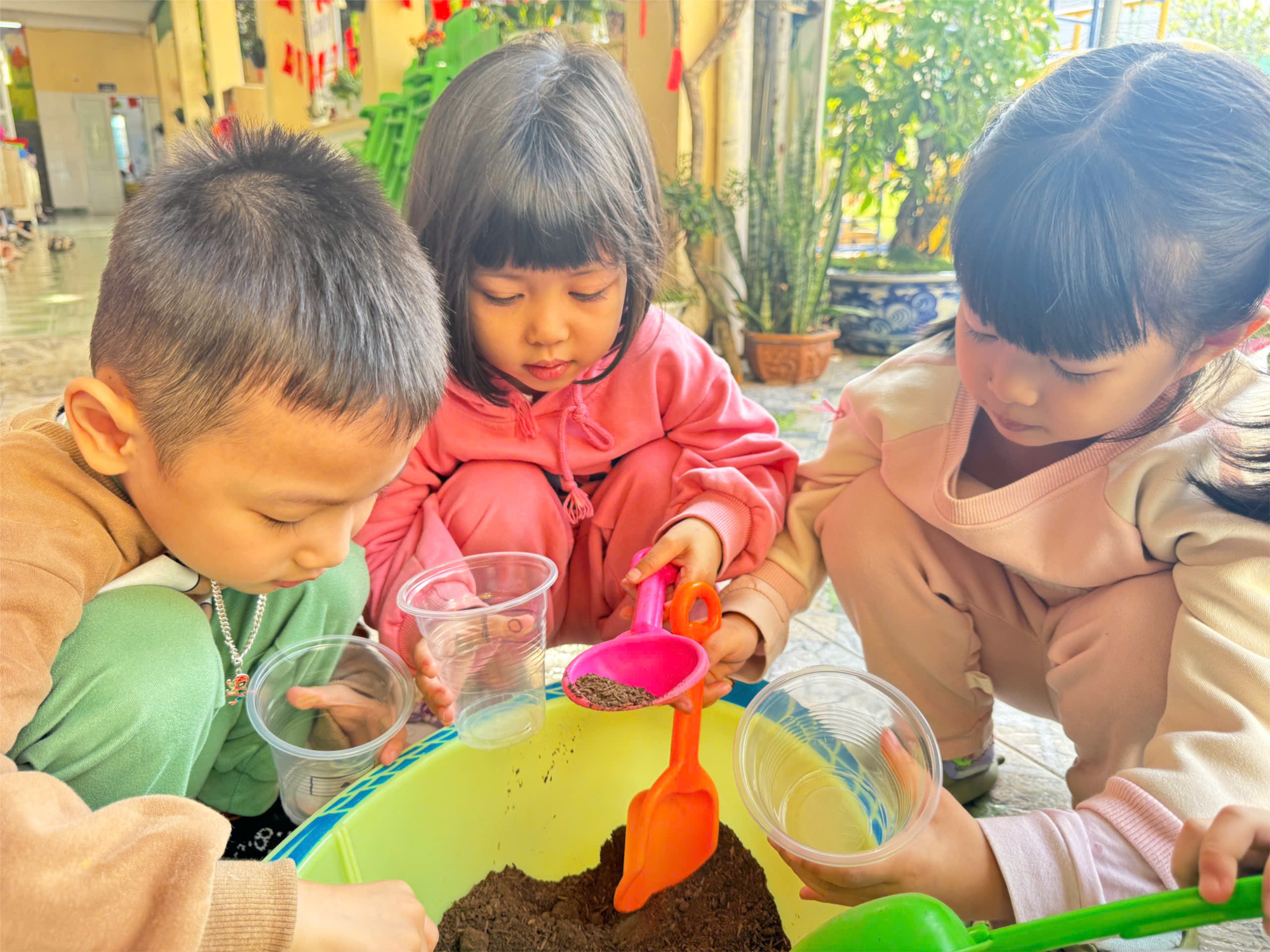 Dưới sự hướng dẫn của cô giáo, các bé được làm quen với hạt giống, đất trồng, chậu cây và tự tay thực hiện từng bước gieo hạt. Những bàn tay nhỏ xinh cẩn thận cho đất vào chậu, đặt hạt giống và tưới nước nhẹ nhàng, ánh lên sự tò mò và say mê khám phá.